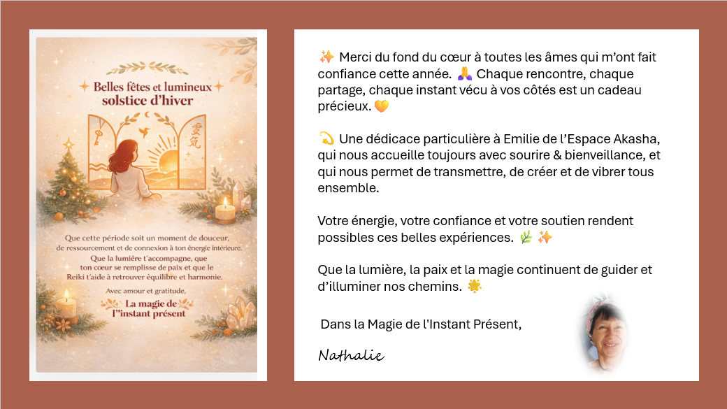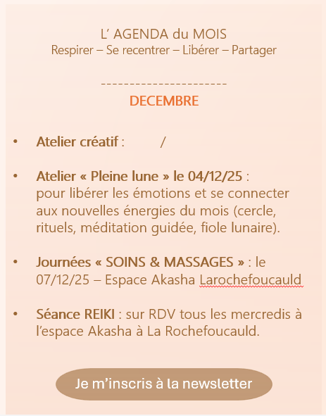 À travers des soins énergétiques (Reiki), des pratiques douces et des rituels symboliques et des ateliers pratiques, vous allez :